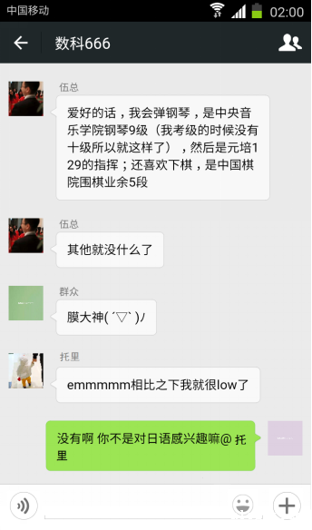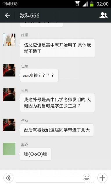 能就学术话题侃侃而谈的伍维晨对音乐很感兴趣,考取了中央音乐学院的钢琴九级(注:伍维晨参加考试时,最高级就是九级)。16年元培“一二九”合唱比赛的指挥也是他;同时他还喜欢下围棋,是中国棋院围棋业余5段。伍维晨从高中就开始担任学生会主席,现任元培学院学生学术协会主席。全面发展加上出众的领导力,“伍总”的外号一经同校的理科状元带进北大,就广为流传。