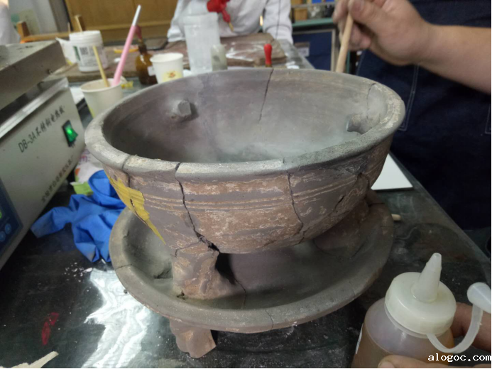 每周四下午的实验室格外热闹,在《无机质文物保护与实验》的课堂上,王卓琦同学正在修复一尊造型独特的陶器。她介绍说,这是从北京通州区出土的汉代陶温鼎,功能类似于现代的火锅。这件器物分为上下两层,是墓葬中的随葬品。它出土时早已碎成了若干残片,而将一堆残缺的陶片还原成一件完整的器物,这个过程并不轻松。在师兄的指导下,从清理到黏结,都是王卓琦亲手完成。黏结完毕的陶“火锅”依然有缺损的地方,“我们会用‘独家秘方’把它补全”,王卓琦神秘地说。