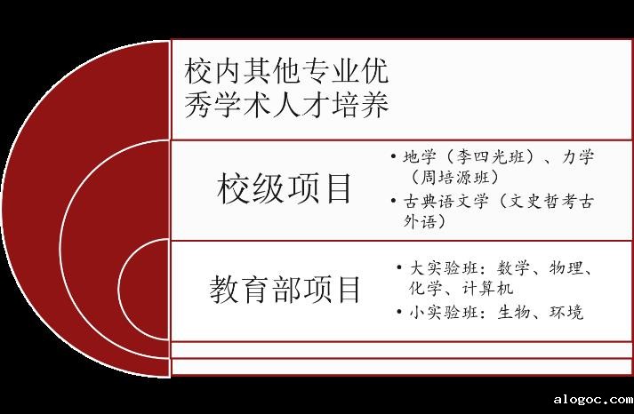 • 覆盖扩大化:目前拔尖计划形成了教育部项目、校级项目、校内其他专业优秀人才培养三大格局。其中教育部项目包括数学、物理、化学、计算机、生物、环境科学六大学科项目,校级项目包括地学(李四光班)、力学(周培源班)、古典语文学(文史哲考古外语)三大专业人才培养项目。此外,学校还启动了其他专业优秀人才培养项目,面向全校院系开放申请。