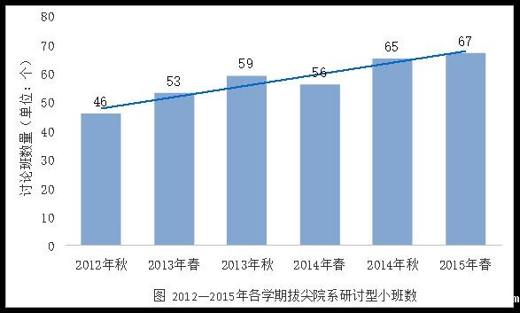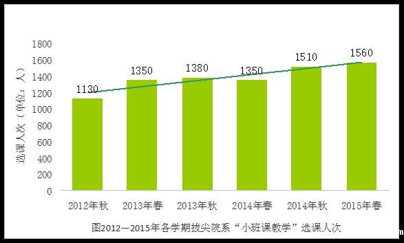 2012年秋季学期至2015年春季学期,拔尖院系共在16门课程上实施了“小班课教学”,共开设67个大班,346个小班,选课学生8280人次。包括院士、长江学者、杰青基金获得者等共计406人次知名教授和骨干教师担任课程主讲教师和小班研讨课指导老师。