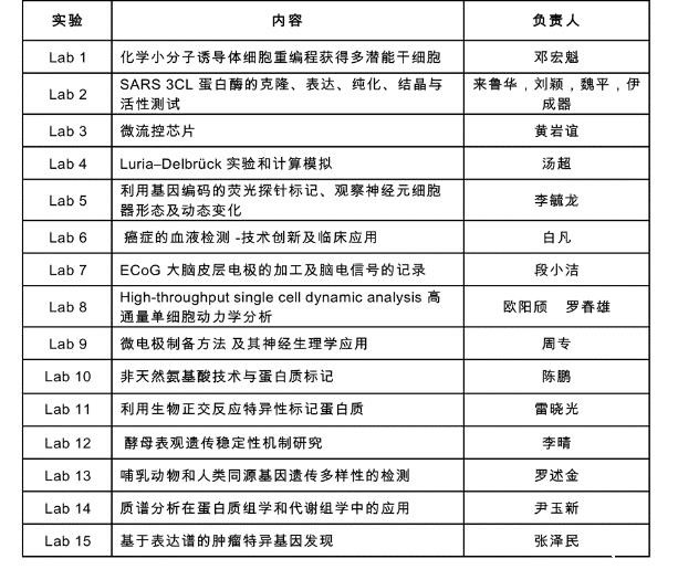 如整合科学专业综合实验课,每个实验需要连续3-4周,每周1天的时间来学习和操作。学生以4-5人为一组,从30个来自不同PI实验室备选实验课题中,按自己兴趣选择8个(每学期4个)参与训练。