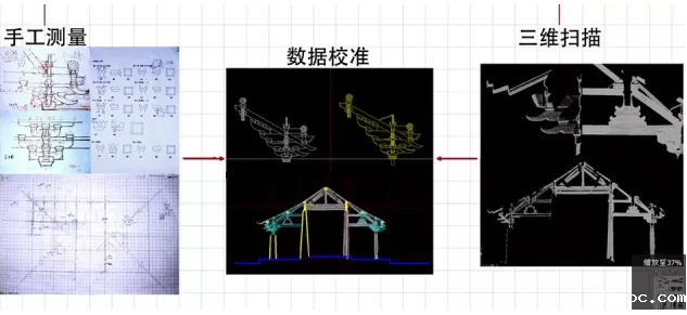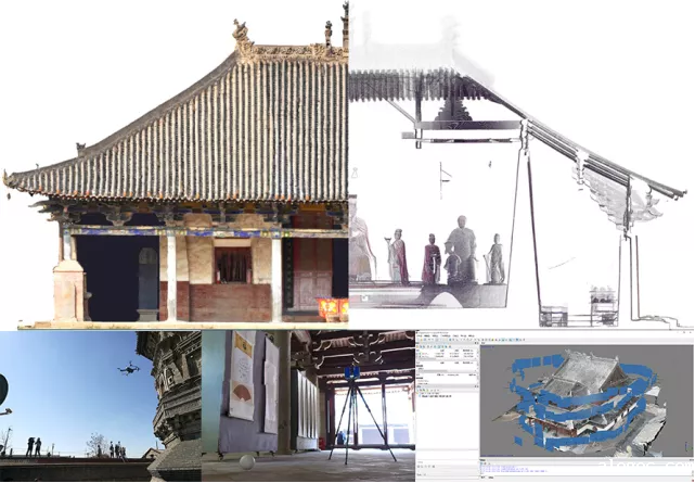 (上:万荣稷王庙摄影测量和三维扫描结合展示,下:无人机航测、三维扫描、摄影测量建模)