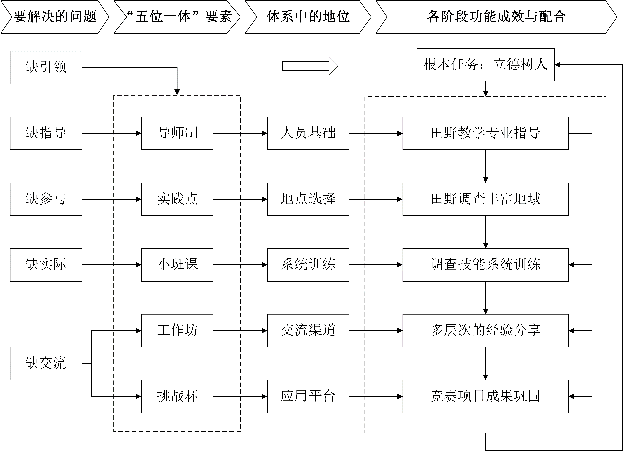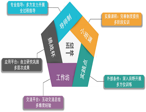 “五位”指导师制、实践基地、小班课、工作坊、“挑战杯”五方面内容,分别解决田野教学中专业指导、田野地点、实操课程、交流渠道、应用平台五个关键问题;“一体”指全周期、全方位、全员参与的教学体系。