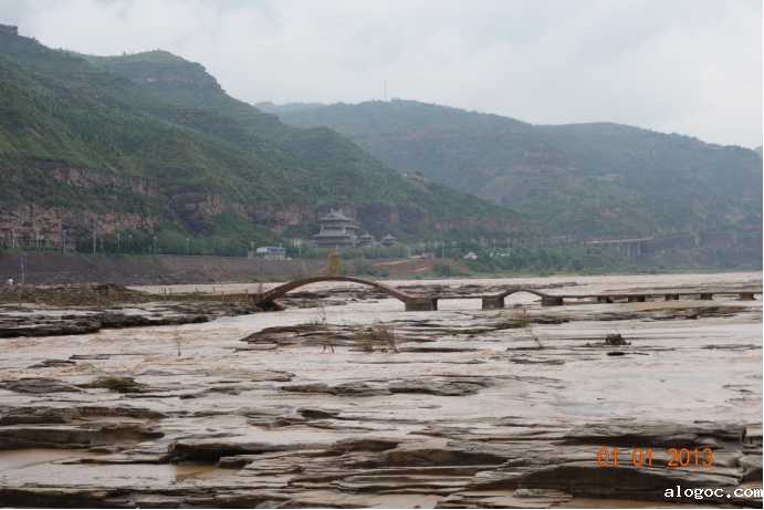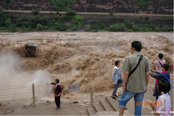 8点从韩城出发。目的地:黄河壶口瀑布。大约12点,下了观光车,终于到达了赫赫有名的壶口瀑布风景区。一眼望过去,并不能看见瀑布,水声也不是那么浩大,引人注目的两岸的河床上河水冲刷过后留下的岩穴与凹槽。那天下着小雨,空气中湿漉漉的,随着人流往前走,壮观的瀑布一点点映入眼帘。