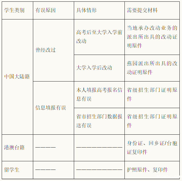 4、 中国大陆籍和港澳台籍贯学生,如“姓名”、“性别”、“出生日期”、“身份证号”信息与本人情况不一致,请根据如下情况,联系学校教务部教务办公室(62751432)并按要求分类提交相应材料。留学生请联系留学生办公室(62751012)并提交相应材料。