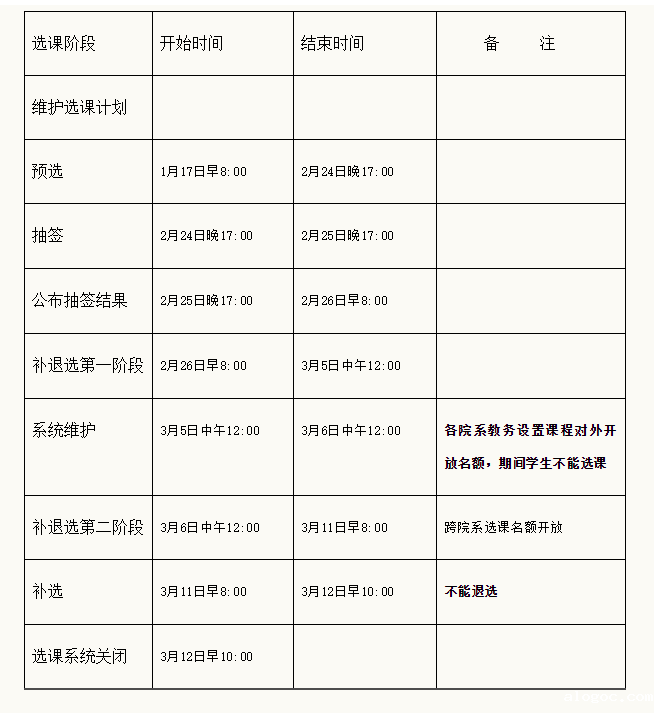 依据学校校历的时间安排,现就2017-18学年第二学期本科生选课具体工作通知如下: