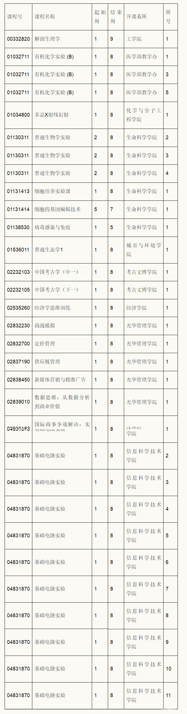 2.第10周之前已经结束的课程不进行中期退课,具体本学期有如下课程: