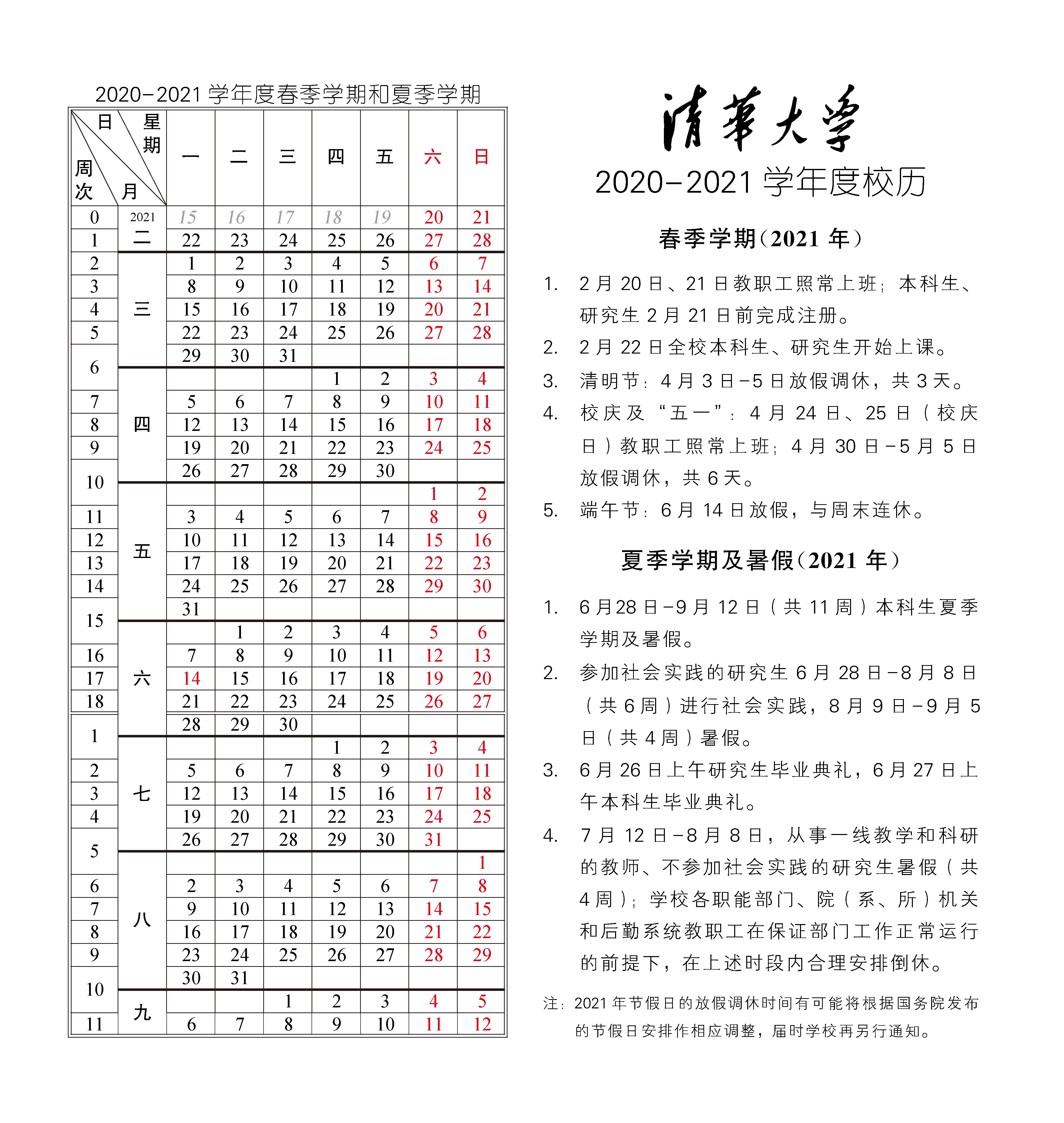 3、请务必仔细查看清华大学校历、上课时间安排、课程详细信息和大纲,尤其注意先修课程、上课时间、上课地点等安排,妥善安排好自己的学业。清华大学校历和详细课程信息请见文末附件。