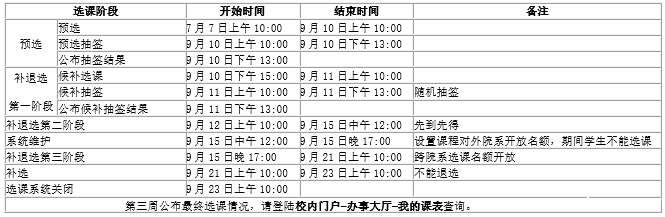 17、所有本科生请在学校规定的时间内进行选课,退课、补选及相关课程调整,选课结束后,选课系统封闭,学生将不能再进行网上操作。