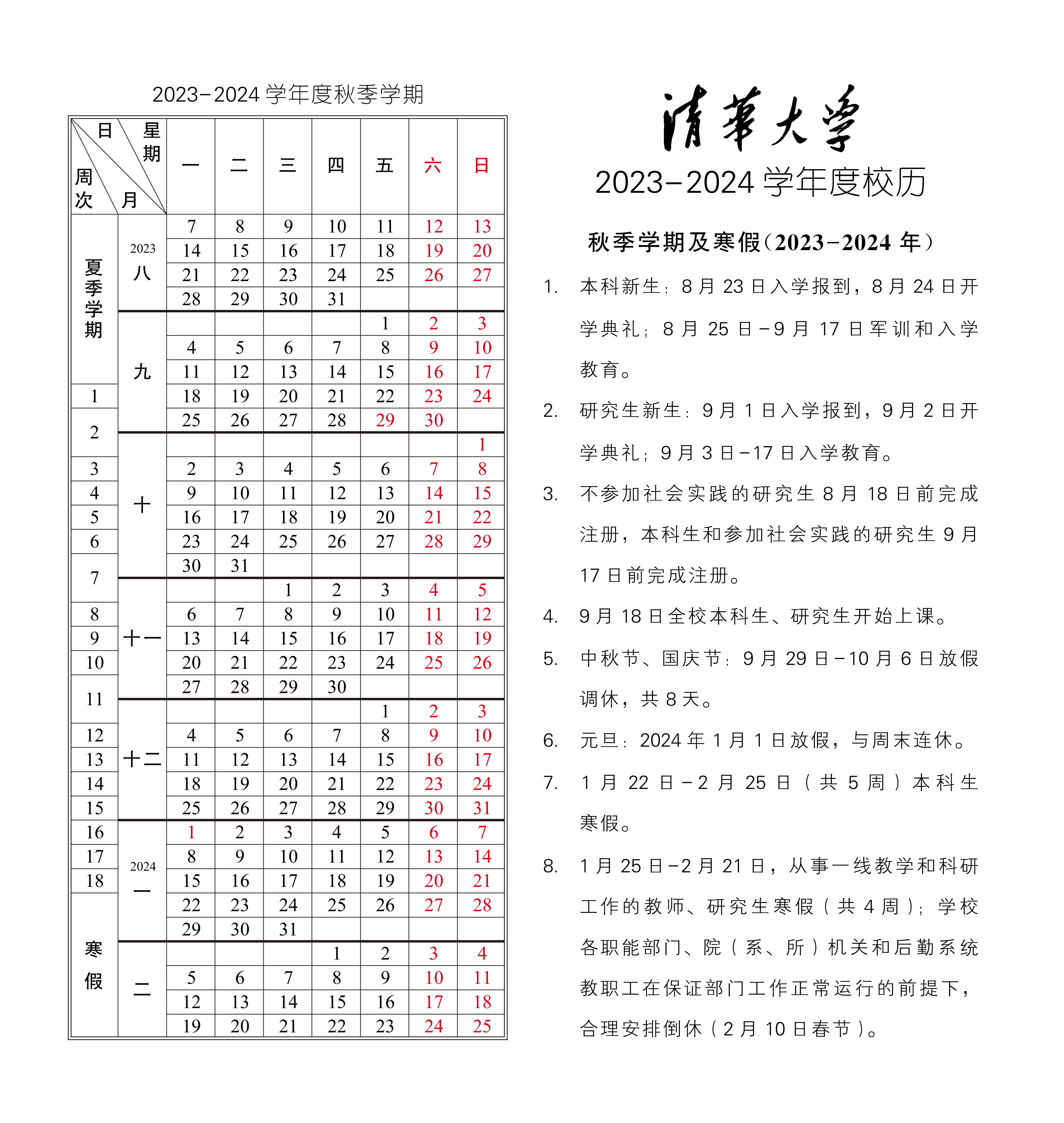 2、请务必仔细查看清华和北外的校历、上课时间安排、先修课程等,课程的详细信息可以在选课系统中查询,妥善安排好自己的学业。请注意:各个学校开始上课的时间不同,北京外国语大学9月4日开始上课,清华大学9月18日开始上课。