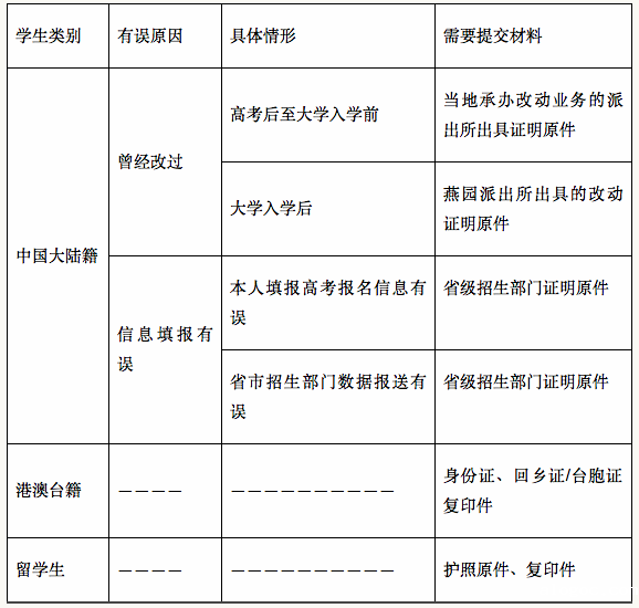 2、 请仔细核对姓名、性别、出生日期、身份证号、生源地和民族信息,如与本人情况不一致,中国大陆籍和港澳台籍学生请联系教务部教务办公室(62751432)并按下表要求分类提交相应材料。