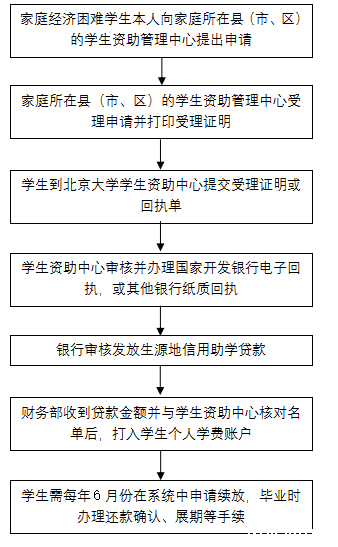 生源地信用助学贷款按年度申请、审批和发放。学生在新学期开始前,向家庭所在县(市、区)的学生资助管理中心提出贷款申请(有的地区直接到相关金融机构申请)。县级学生资助管理中心负责对学生提交的申请进行资格初审。学生到校报到后提交生源地贷款回执,学校协助金融机构负责审批并发放贷款。