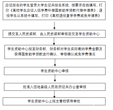 国家对应征入伍服义务兵役的高校学生,在入伍时对其在校期间缴纳的学费实行一次性补偿或获得的国家助学贷款(包括高校国家助学贷款和生源地信用助学贷款)实行代偿;应征入伍服义务兵役前正在高等学校就读的学生(含按国家招生规定录取的高等学校新生),服役期间按国家有关规定保留学籍或入学资格、退役后自愿复学或入学的,国家实行学费减免。