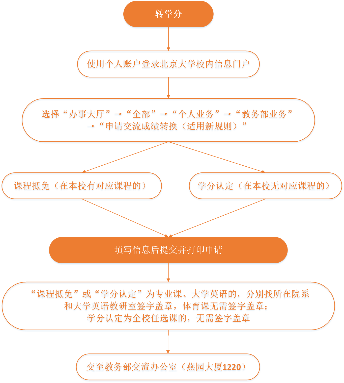4、持申请表、成绩单原件和复印件至教务部交流办公室(燕园大厦1220)现场办理转学分手续。