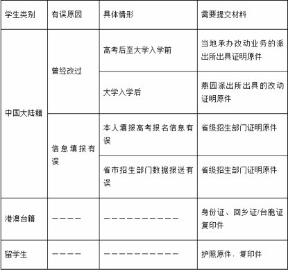 2、 请仔细核对姓名、性别、出生日期、身份证号、生源地和民族信息,如与本人情况不一致,中国大陆籍和港澳台籍学生请联系教务部教务办公室(62751432)并按下表要求分类提交相应材料。留学生如信息与本人实际信息不一致,请联系留学生办公室(62751012)。