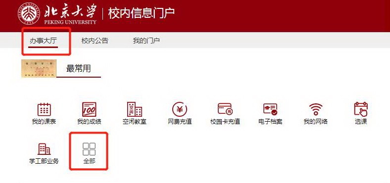 1、登陆校内信息门户(点击请进),选择“办事大厅”——“全部”——“个人业务”——“教务部业务”。