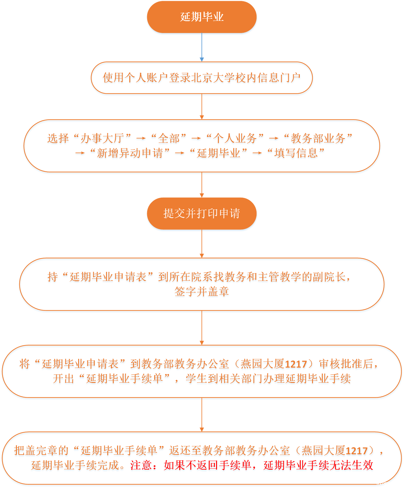8、把盖完章的“延期毕业手续单”返还至教务部教务办公室,延期毕业手续完成。注意:如果不返还手续单,延期毕业手续无法生效。