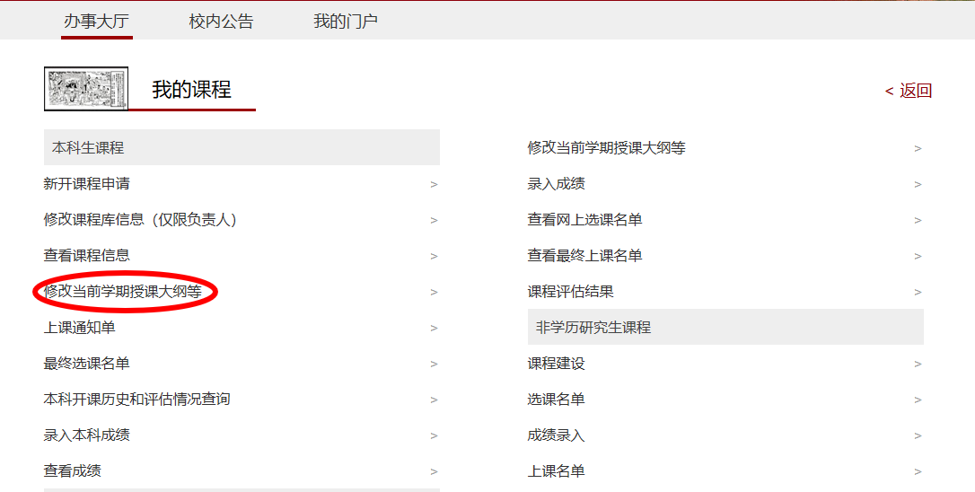 当前学期任课教师可以通过“登录校内门户-办事大厅-我的课程-修改当前学期授课大纲等-选中需要修改的课程-点击‘修改教学大纲’按钮修改所授班级课程的简介大纲等”。